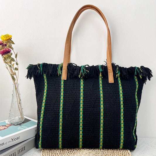 Women's Cotton Stripe Classic Style Tassel Square Magnetic Buckle Tote Bag