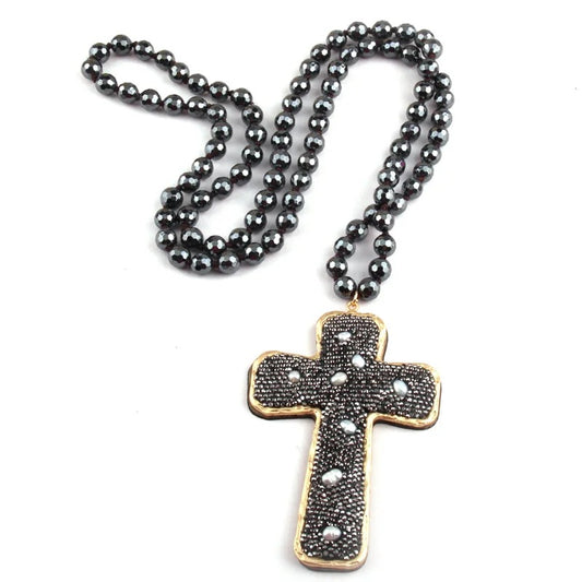 Retro Cross Red Iron Beaded Chain Pendant Necklace Sweater Chain In Bulk Natural stone necklace