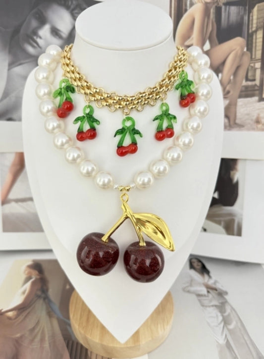 Cute Oversized Cherry Pearl 18K Gold Plated Artificial Pearl Glass Brass Beaded Chain Statement Necklaces