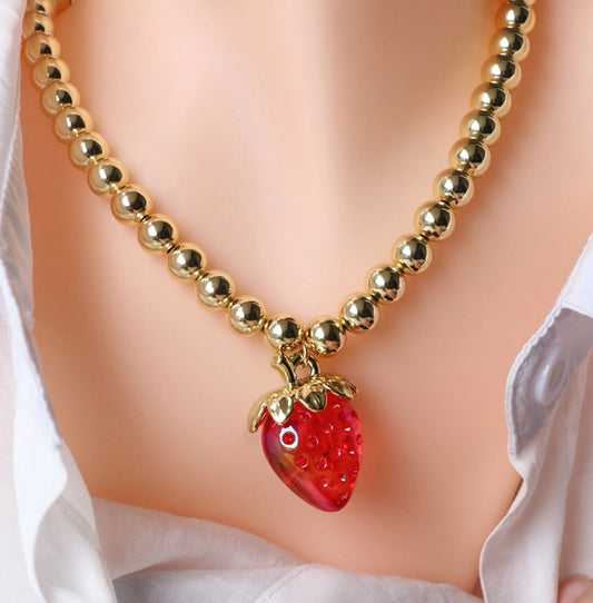Resin Copper 18K Gold Beaded Chain 18K Gold Plated Cherry Strawberry Pendant Necklace