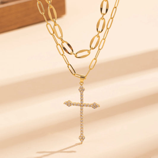 Jewelry Elegant Cross 201 Stainless Steel Copper Zircon Inlay Double Layer Necklaces