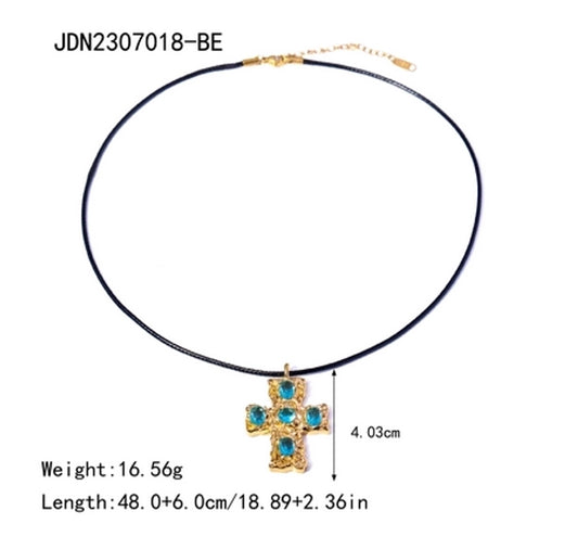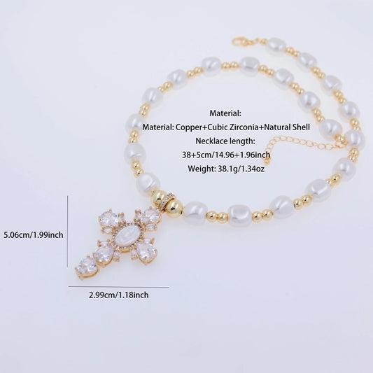 Copper 18K Gold Plated Beaded Cross Shell Zircon Pendant Necklace