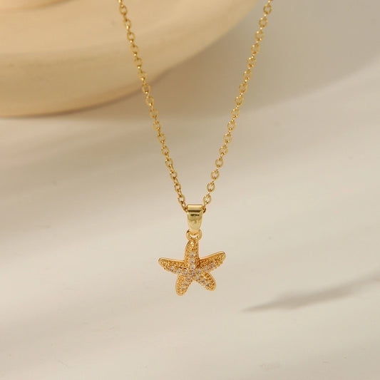 304 Stainless Steel Copper 18K Gold Plated Beach Simple Style Inlay Starfish Shell Fish Tail Artificial Pearls Zircon Pendant Necklace