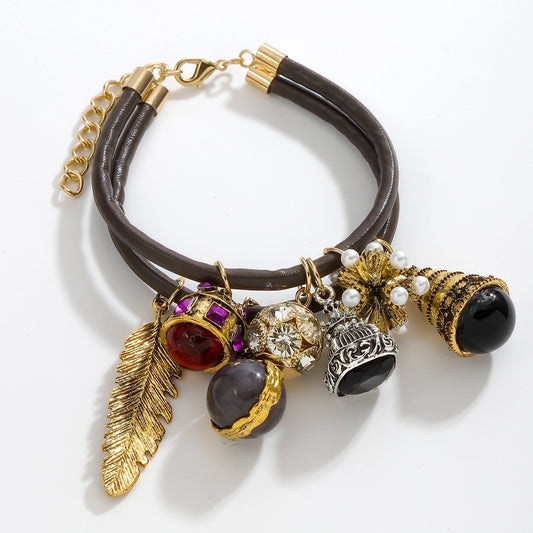 Vintage Style Geometric Leaves Artificial Gemstones Rhinestones Pu Leather Alloy Wrap Bracelets