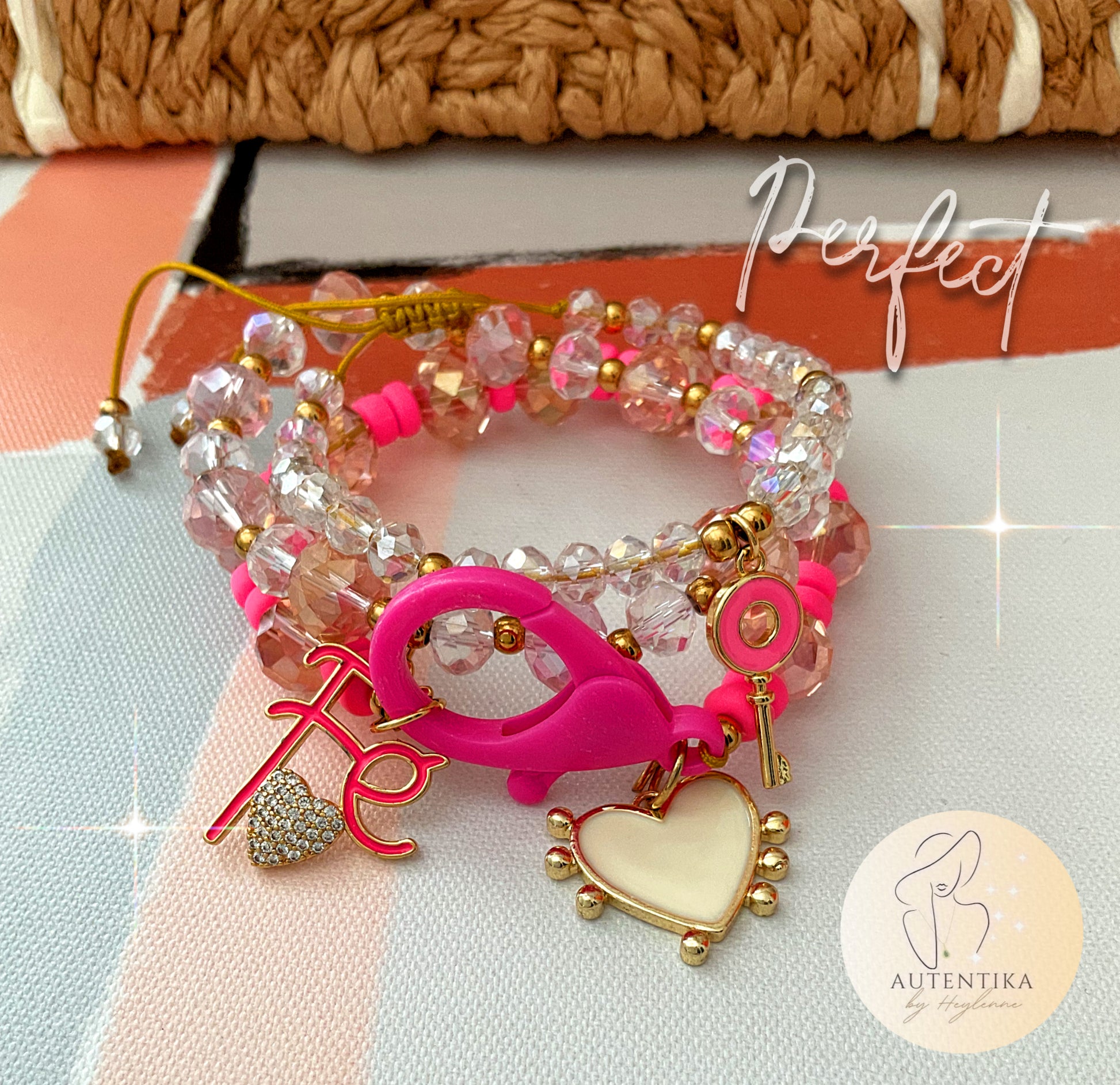 Cada set está elaborado a mano con cristales facetados, cuentas doradas y charms que simbolizan amor, protección y propósito.