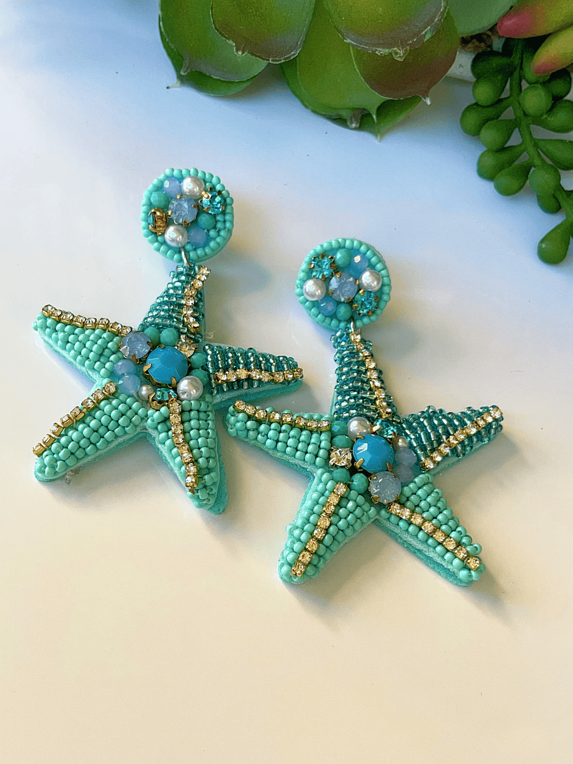 Aretes trabajados artesanalmente bordados forma de estrella de mar en mostacillas color azul con hermosas pidras en criatal tonalidades que la hacen lucir elegantes .